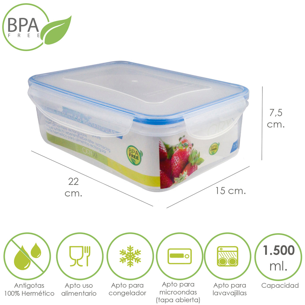 Recipiente Hermetico Plastico Rectangular 1.500 ml. 22x15x7.5 (Alt.) cm.